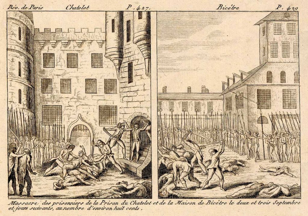 Le 2 septembre, 3000 prisonniers sont alors incarcérés dans 9 prisons parisiennes, qui sont pris pour cible par diverses bandes pour des exécutions sommaires : l’Abbaye de St Germain des Près, les Carmes, la Force, la Conciergerie, le Châtelet, la Salpêtrière, les Bernardins, St Firmin, Bicêtre. Ils y massacrent sans distinction prêtres, aristocrates, prostituées. Environ 1100 victimes sont à déplorer au total; Les crimes ne seront jamais poursuivis.
