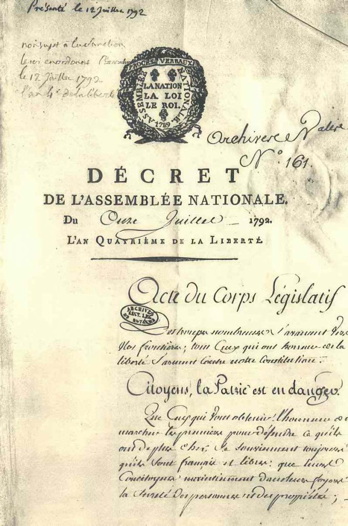 Devant l’accroissement des périls extérieurs provoqués par la guerre ( la Prusse rejoint l’Autriche contre la France), l’Assemblée Nationale déclare “la Patrie en danger”.