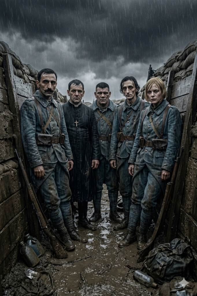Claire. Infirmière. Allemande, comme il s’est avéré ensuite, mais nous ne le savions pas alors, elle s’était présentée avec des papiers français en règle, un accent alsacien parfaitement crédible, une formation hospitalière qu’aucun examen ne mit en défaut, et elle prit son service dans notre ambulance de l’avant à l’automne 1917. Une excellente infirmière. Je pèse le mot parce qu’il le mérite, excellente, au sens où je l’emploie rarement et où je l’emploie ici en connaissance de cause, moi qui ai vu défiler pendant quatre ans toutes les catégories de personnel soignant que la République expédiait au front. Claire savait son métier. Elle pansait vite et bien, elle triait avec justesse, elle ne fléchissait pas devant les plaies que les plus aguerries fléchissaient à voir, et elle parlait aux mourants avec cette justesse de ton qui ne s’apprend ni dans les écoles ni dans les manuels et qui relève d’une grâce particulière que certaines femmes ont et que d’autres n’auront jamais. Marcello l’aimait bien. Le père Isidore l’aimait bien. Timothée, qui aimait bien peu de gens, l’aimait bien. Moi aussi, bien sûr. L’amitié de tranchée s’était étendue à elle avec la même naturalité qu’elle s’étendait entre nous quatre, sans chichis, sans calcul, parce qu’elle en était digne par son travail et par son caractère et parce qu’au sortir des journées où l’on voyait ce que nous voyions, on ne faisait plus la différence entre le soignant et le soigné, entre l’homme et la femme, entre le soldat et l’infirmière. On faisait la différence entre ceux qui tenaient et ceux qui craquaient. Claire tenait. Elle faisait partie des nôtres. Voilà ce qu’elle était. Rien de plus, rien de moins. Une camarade de plus dans le cercle, respectée, estimée, écoutée.