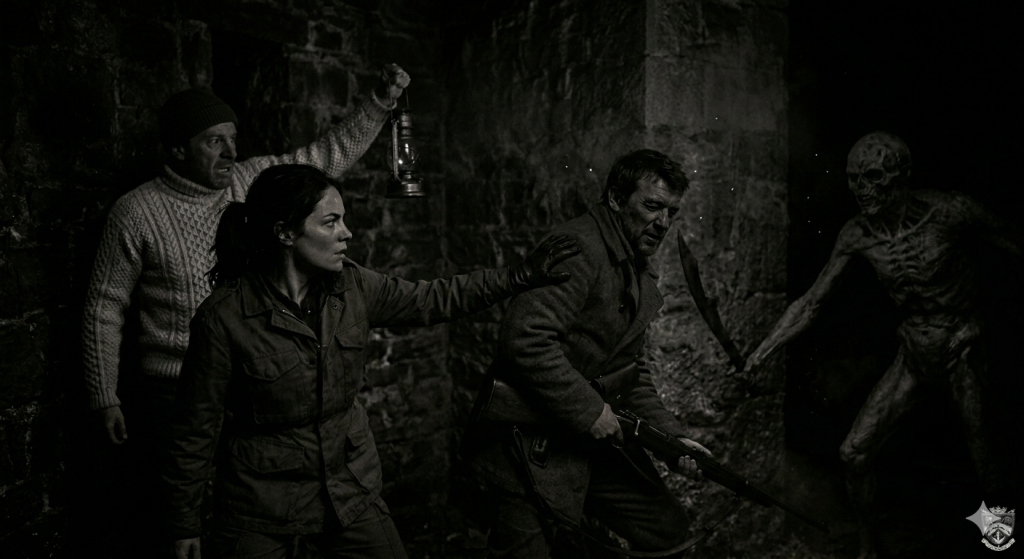 Je perçus leurs souffles — courts, épuisés, mais réguliers. Hervé avait perdu le Remington quelque part dans la montée et tenait son revolver de la cheville dans la main droite avec ce pragmatisme des gens qui utilisent ce qu’ils ont. Nous tirâmes. Les trois, presque simultanément, dans l’espace réduit du sommet de la tour avec un vacarme qui se démultipliait dans les parois de pierre.