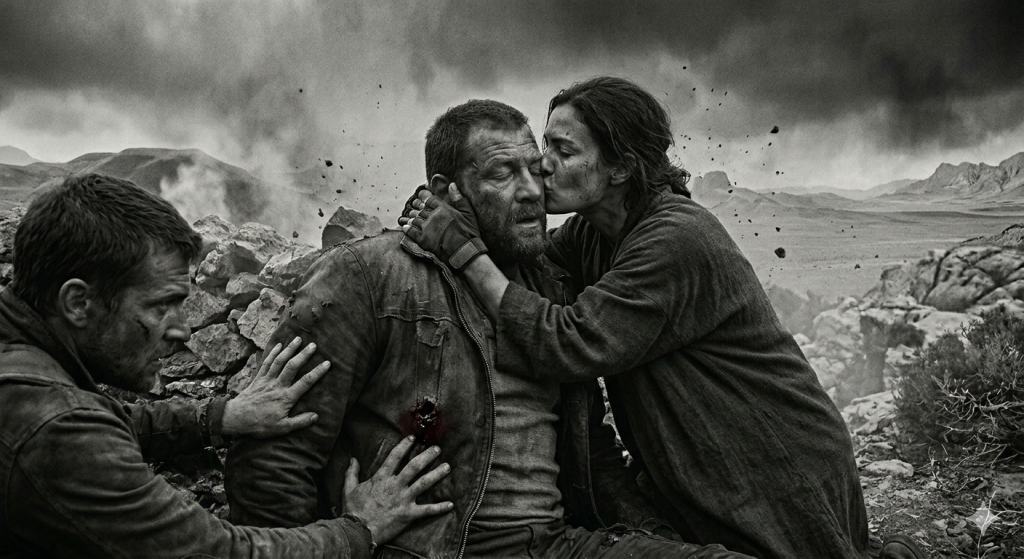 Pas comme on embrasse quelqu’un qu’on réconforte. Pas la tendresse calculée ni le geste fraternel. Quelque chose de plus vrai que ça, de plus nu — la tendresse qui ne peut plus mentir parce qu’il n’y a plus le temps de mentir, le sentiment qui remonte à la surface quand toutes les convenances ont été pulvérisées par la poudre et le sang et la certitude que demain n’est pas garanti. Je détournai les yeux. Non par pudeur — la pudeur était une autre de ces choses que cette nuit avait emportées. Je détournai les yeux parce que ce que je voyais m’appartenait encore moins que tout le reste.
