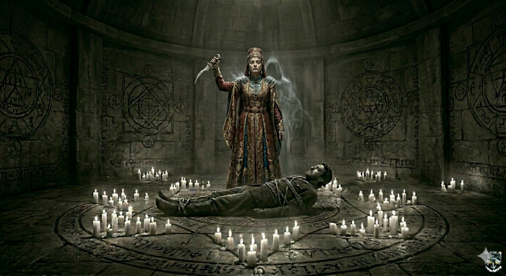 Je la reconnus sans l’avoir jamais vue — la façon dont on reconnaît une vérité qu’on a longtemps portée abstraitement et qui se matérialise soudain devant soi. Elle était au centre de ce dispositif de lumières et d’inscriptions, debout mais absente, ses yeux ouverts sur quelque chose que je ne pouvais pas voir. La dague sacrificielle — une lame différente de celle du Baron, plus ancienne encore, d’une ancienneté que la simple métallurgie ne suffisait pas à expliquer — était levée dans sa main au-dessus d’un corps.