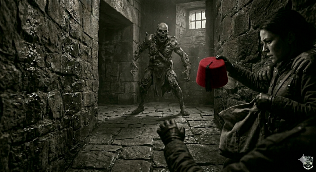 Ma voix dans cet espace confiné était une chose étrange — je l’entendis de l’extérieur, comme si elle appartenait à quelqu’un d’autre, quelqu’un qui avait pris des décisions que la réflexion ordinaire n’aurait peut-être pas ratifiées mais que les circonstances rendaient absolument nécessaires. Le Fez. Le Fez écarlate que nous portions dans ce sac depuis le début de l’assaut, cet artefact maudit que nous avions récupéré depuis les quais de Kassim Pacha et dont nous connaissions les propriétés depuis assez longtemps pour en mesurer le prix. Le coiffer. Contrôler la bête.