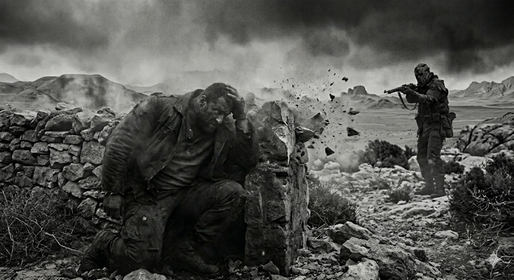 Un autre homme — ou ce qui avait été un autre homme — surgit depuis l’angle mort d’une ruine et pressa la détente à moins de dix yards. Le mécanisme rendit un cliquetis sec, métallique, définitif dans sa vacuité. L’arme était enrayée. Ce son — ce son du destin qui bégaie, du mécanique qui trahit au moment précis où il ne peut pas se permettre de trahir — ce son nous offrit quelques secondes supplémentaires d’existence que nous n’avions pas mérité davantage que tous ceux qui étaient tombés cette nuit.